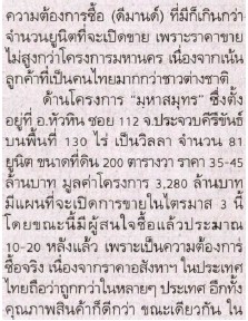 MahaSamutr is loacated in 130-rai at Hua Hin 112. The development is comprised of 81 luxury villas, Country Club and Beach Club. Each villa offers 200 sq. wah with the starting price at 4o million baht. Overall investment of Bht 3,280 million. The villas will be ready to sell in Q3 this year. Up to now there are already 10-20 customers ready to buy villas once sales commence. One of factors that has encouraged people to buy is the price of property in Thailand is cheaper than many countries.
