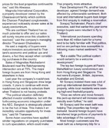 Mr. Sorapoj Techakraisri, CEO of PACE Development Corporation Plc. said there have been a lot of foreign demands for Thai properties, while local residents are seeking high-end freehold properties. The weak baht has encouraged buyers to make purchase decision.