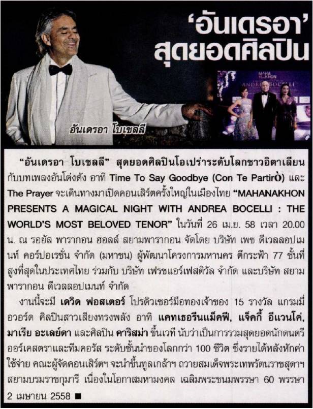 “ANDREA BOCELLI”, the world-class Italian opera singer, will be singing his famous songs, such as Time to Say Goodbye (Con Te Partirò) and The Prayer at his first concert in Thailand, “MAHANAKHON PRESENTS A MAGICAL NIGHT WITH ANDREA BOCELLI : THE WORLD’S MOST BELOVED TENOR” on April 26, 20.00 at Royal Paragon Hall, Siam Paragon. The concert is hosted by PACE Development Corporation Plc, the developer of 77-storey MahaNakhon development, Thailand’s tallest tower, and Fresh Air Festival Co., Ltd.
