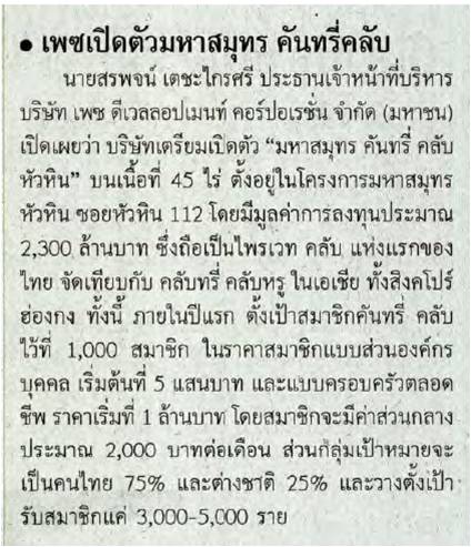 Mr. Sorapoj Techakraisri, Chief Executive Officer, PACE Development Corporation Plc, recently unveiled MahaSamutr Country Club Hua Hin, Thailand’s first world-class all-activity members-only Country Club located in the 120 rai MahaSamutr Hua Hin development on the Hua Hin 112 road with project value Bht 2,300 million. It aims for 1,000 membership sales within 2015.