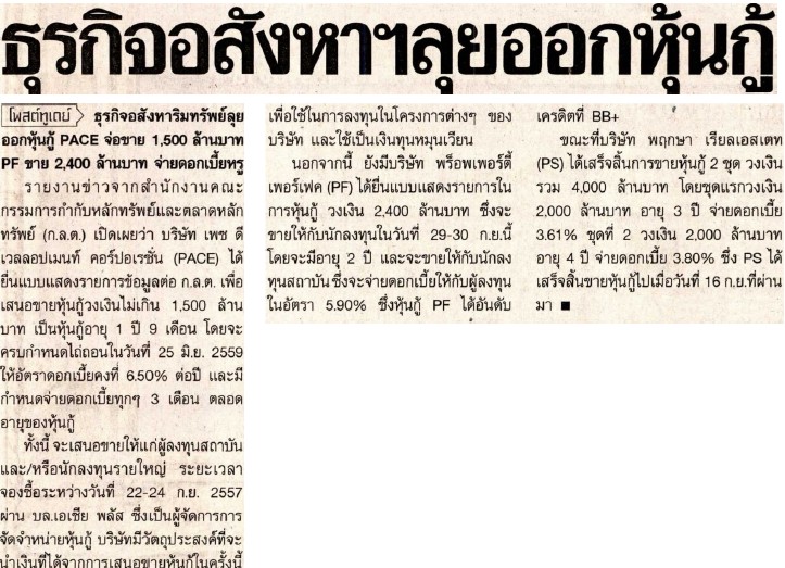 SEC announced that PACE Development Corporation Plc. or PACE has filed to SEC that it will issue debentures worth 1.5 billion baht with a 6.50 percent interest per year. The interest will be paid back quarterly. The reservation period for its debentures will be during September 22-24 through Asia Plus.