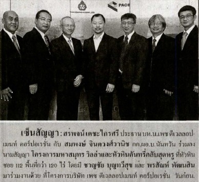 Sorapoj Techakraisri, CEO of PACE Development Corporation Plc. along with the executive of Thai Obayashi Corp. Ltd. management jointly signed a contract of MahaSamutr project, locating on 120-rai land in Hua Hin.