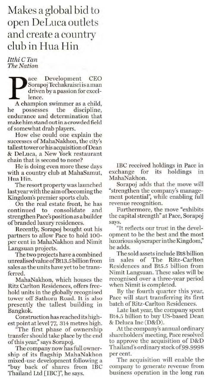 PACE Development Corporation Plc. led by CEO Sorapoj Techakraisri signed a lease agreement to open a DEAN & DELUCA Gourmet Market at 40 Wall Street with The Trump Organization, led by Donald J. Trump, chairman of The Trump Organization.